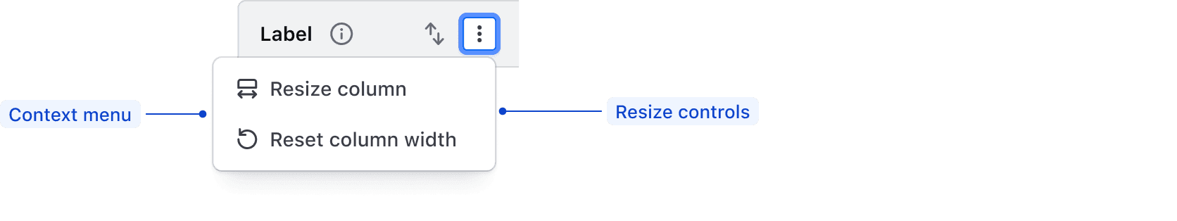 When resizable columns are enabled, actions related to each function are rendered in a context menu in the table header. These functions are not customizable.